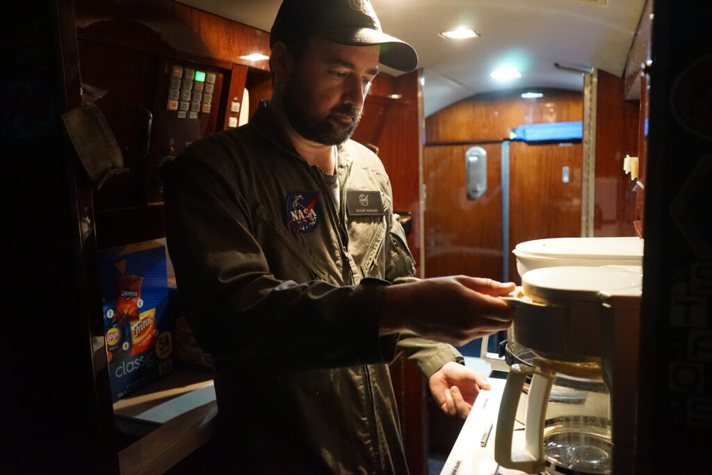 Shortly after a smooth take-off, flying over the ocean, the viewport on the bottom of the plane is opened and HSRL-2 is turned on. The flight towards the EarthCARE track begins. While keeping an eye on the instrument and data coming in, it is time for snacks (stocked up by John Hair), music trivia, jokes, and riddles with the pilots joining in as well. There is even an option to make coffee on the plane. Taylor shows his expertise in all these fields.