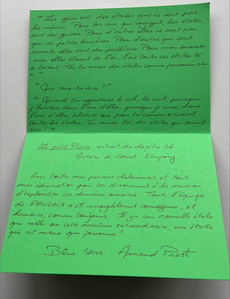 Avec toutes mes pensées chaleureuses et toute mon admiration pour ton dévouement à la mission d’exploration ces dernières semaines. Toute l’équipe de PANGAEA a été incroyablement courageuse, et humaine, comme toujours. Il y a une nouvelle étoile qui veille sur cette aventure extraordinaire, une étoile qui rit mieux que personne!