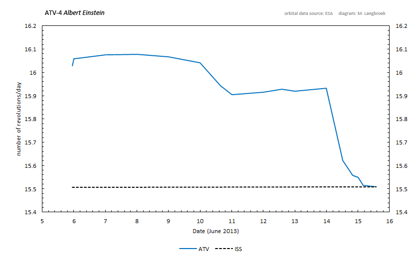It might surprise you, but over the past two days [speaking with respect to launch on 10 June – Ed.] the orbital altitude of ATV-4 has gradually come down, not up. You can see this in the diagram above. It concerns a slight orbital altitude decrease of just a few kilometres, no more. This is because the ATV is currently just moving in a parking orbit around earth without major manoeuvring. As a result, the orbit currently slightly decays (it is slowly pulled in by Earth as a result of gravity and atmospheric drag): it is very slightly coming down!