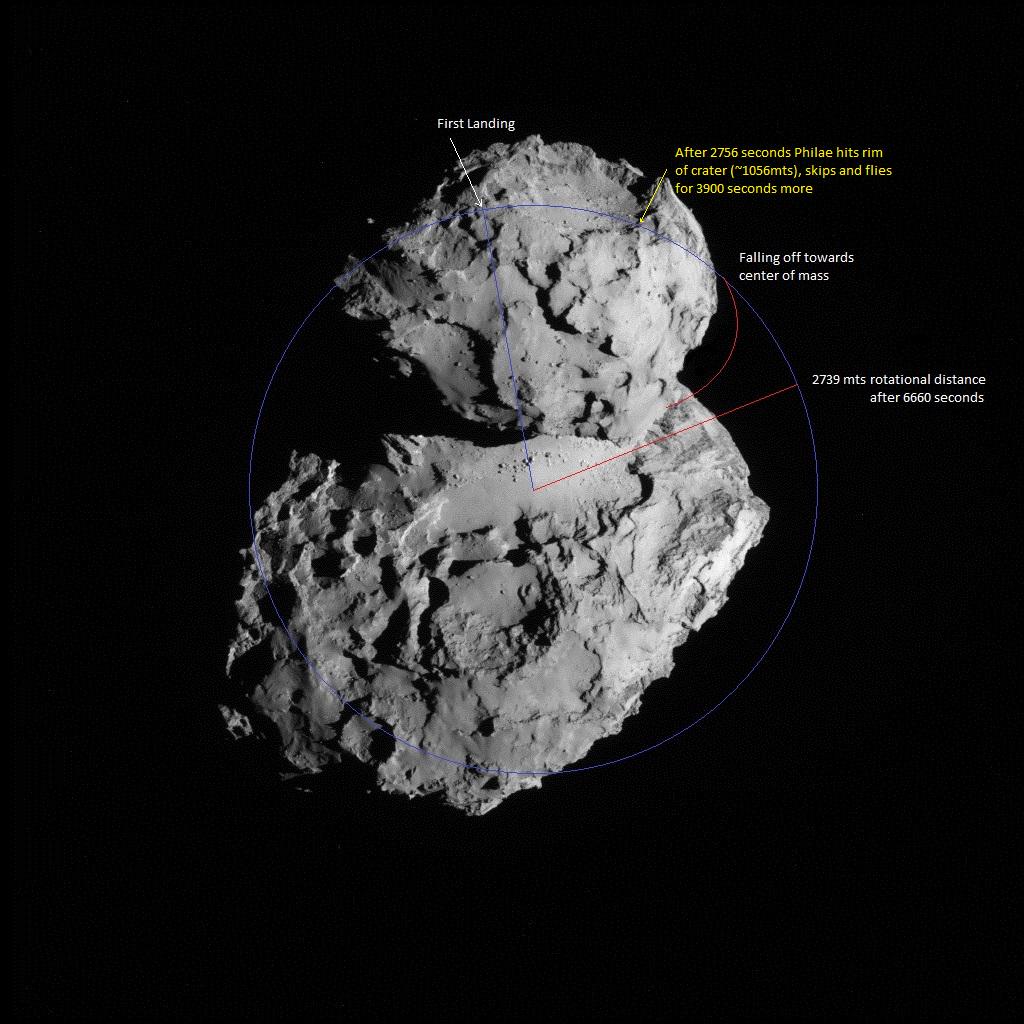 After 37 seconds of the video, Philae has not reached the top of the crater rim, the height of the trajectory is too high, but not by a large amount. This conveniently allowed her to pass through a dip in the crater wall, JUST. We must remember as well as Philae’s velocity, the comet’s rotation gives the moving surface a velocity relative to Philae, which varies depending on her height and the local gravity. The direction of that motion is seen in the OSIRIS montage of Philae’s landing. Philae is dropping almost straight down with respect to the comet’s centre of gravity, so her apparent motion across the comet is due to the motion of the comet surface under her.
